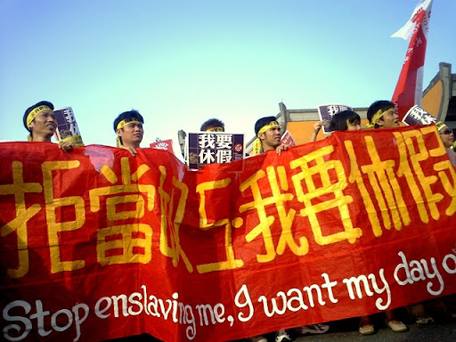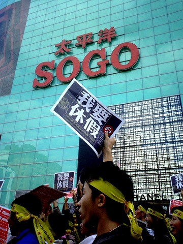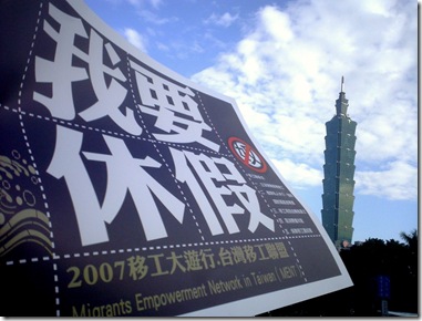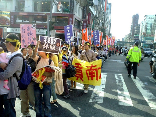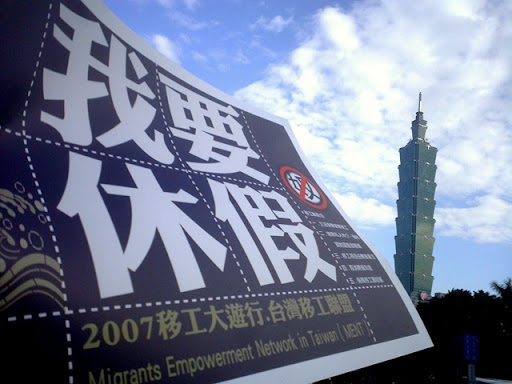 然而,以上勞基法卻不把在臺灣境內的家庭類的外籍看護工法含括在內,因此他們連基本休假也沒有。12月9日的下午1點三十分,盡管到了年末時分,陽光還是暖暖的。在忠孝復興捷運站二號出口,SOGO百貨公司前面擠滿了人。臺灣移工聯盟(MENT) 在這里召集,“我要休假——移工大游行”。到現場的除了來自東南亞各地的移工,還有臺灣的民間團體,他們用東南亞各國的語言喊出“我要休假”的口號。現場各語言交織在一塊,像是小聯合國。同時各媒體記者在圍繞移工拍照,做訪問。當場也有個柜臺,供個人的參與報名,并發送一條印有各國語言標題的小布條,和大卡片。