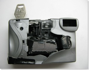 插個鑰匙,以便用來轉動底片,不過這種用後即丟的相機的設計是倒著裝片,因此需要在暗房裡裝底片。不過用這種用後即丟相機來做針孔相機有個好處,就是可以利用之前的齒輪跟一些機制,以便轉底片時知道轉了多少。我到現在還沒勇氣用火柴盒之類的東西來做,希望下次能嘗試。