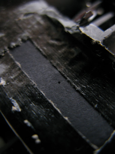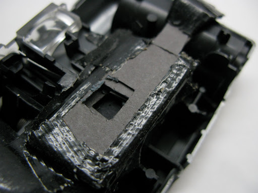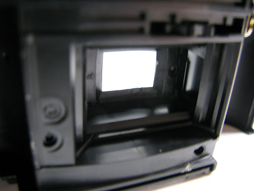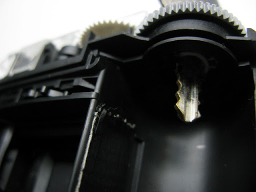 插個鑰匙,以便用來轉動底片,不過這種用後即丟的相機的設計是倒著裝片,因此需要在暗房裡裝底片。不過用這種用後即丟相機來做針孔相機有個好處,就是可以利用之前的齒輪跟一些機制,以便轉底片時知道轉了多少。我到現在還沒勇氣用火柴盒之類的東西來做,希望下次能嘗試。